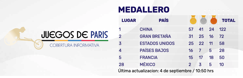 Atletas mexicanos han destacado en diferentes competencias y ganado medallas. Estos son los resultados destacados que sumado en el medallero de los Paralímpicos de París 2024.